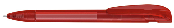 Retractable ballpoint pen with transparent frosted housing, wide curved clip button and tip.