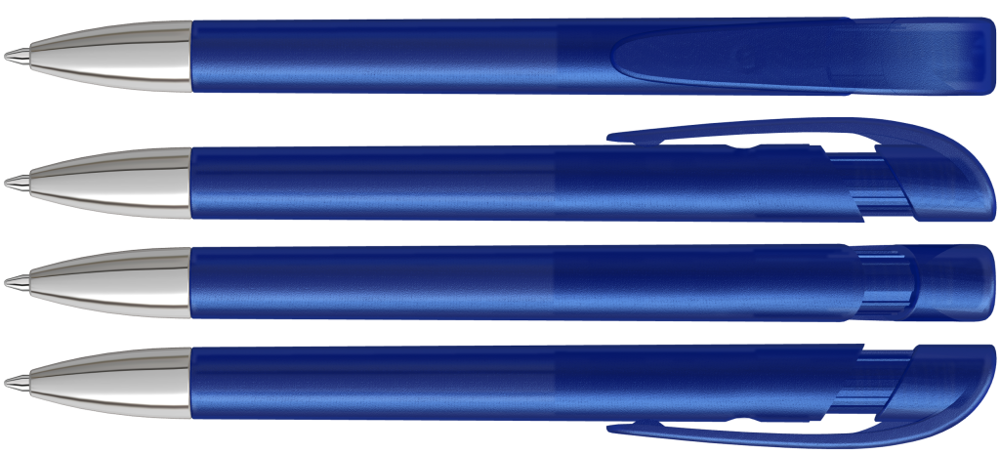 Retractable ballpoint pen with transparent frosted housing, wide curved clip button and tip chrome plated.