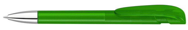 Retractable ballpoint pen with transparent frosted housing, wide curved clip button and tip chrome plated.