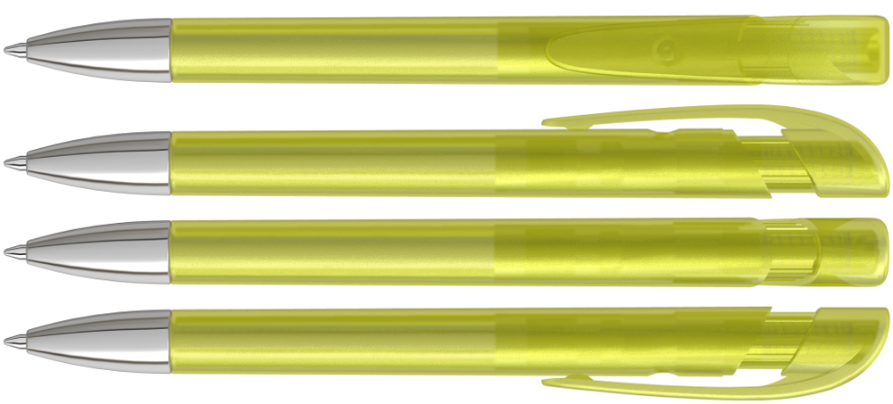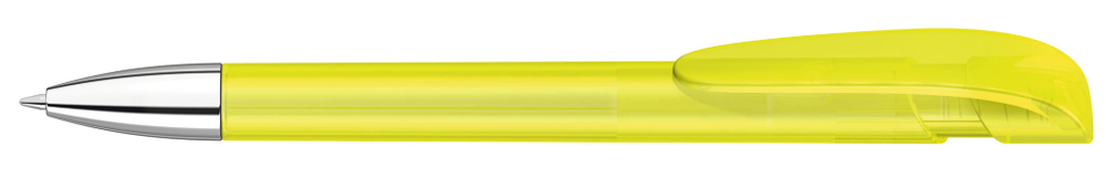 Retractable ballpoint pen with transparent frosted housing, wide curved clip button and tip chrome plated.