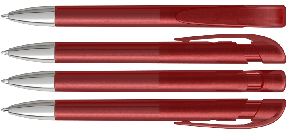 Retractable ballpoint pen with transparent frosted housing, wide curved clip button and tip chrome plated.