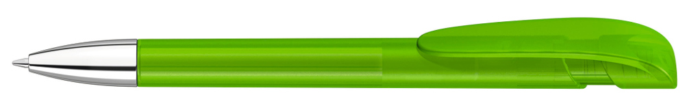 Retractable ballpoint pen with transparent frosted housing, wide curved clip button and tip chrome plated.