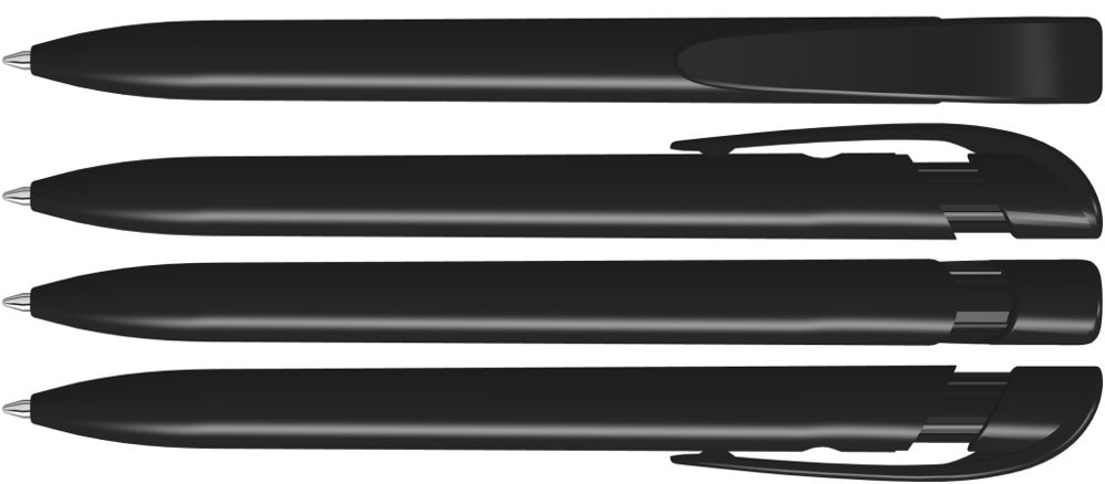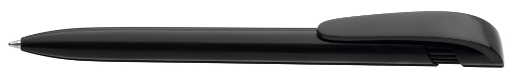 Retractable ballpoint pen with opaque glossy housing in black or white and wide curved clip button. more