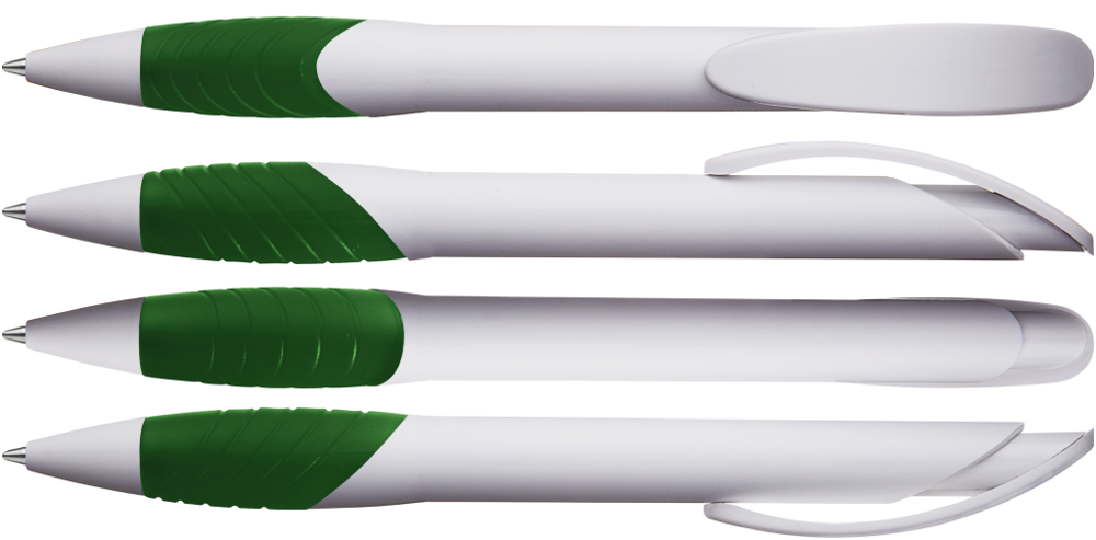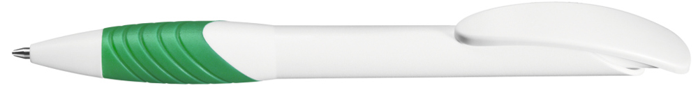 Retractable ballpoint pen with opaque matt housing, curved clip push-button and tip in white, ergonomic coloured rubber grip zone.