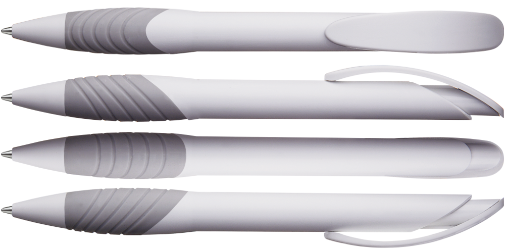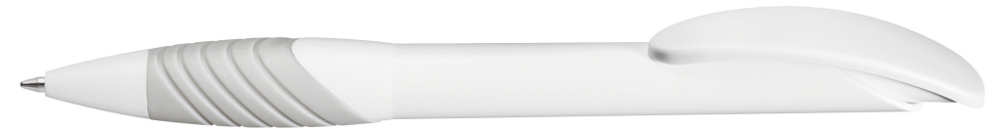 Retractable ballpoint pen with opaque matt housing, curved clip push-button and tip in white, ergonomic coloured rubber grip zone.