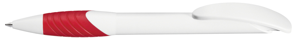 Retractable ballpoint pen with opaque matt housing, curved clip push-button and tip in white, ergonomic coloured rubber grip zone.