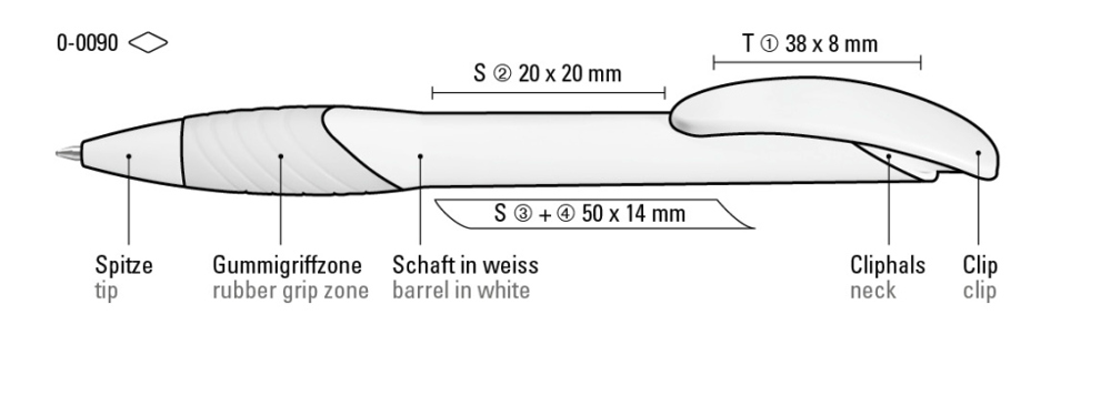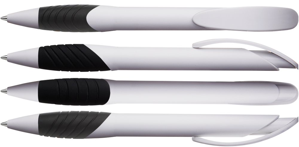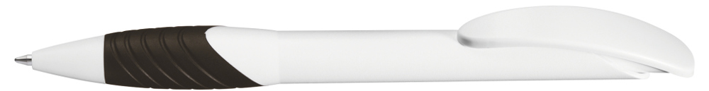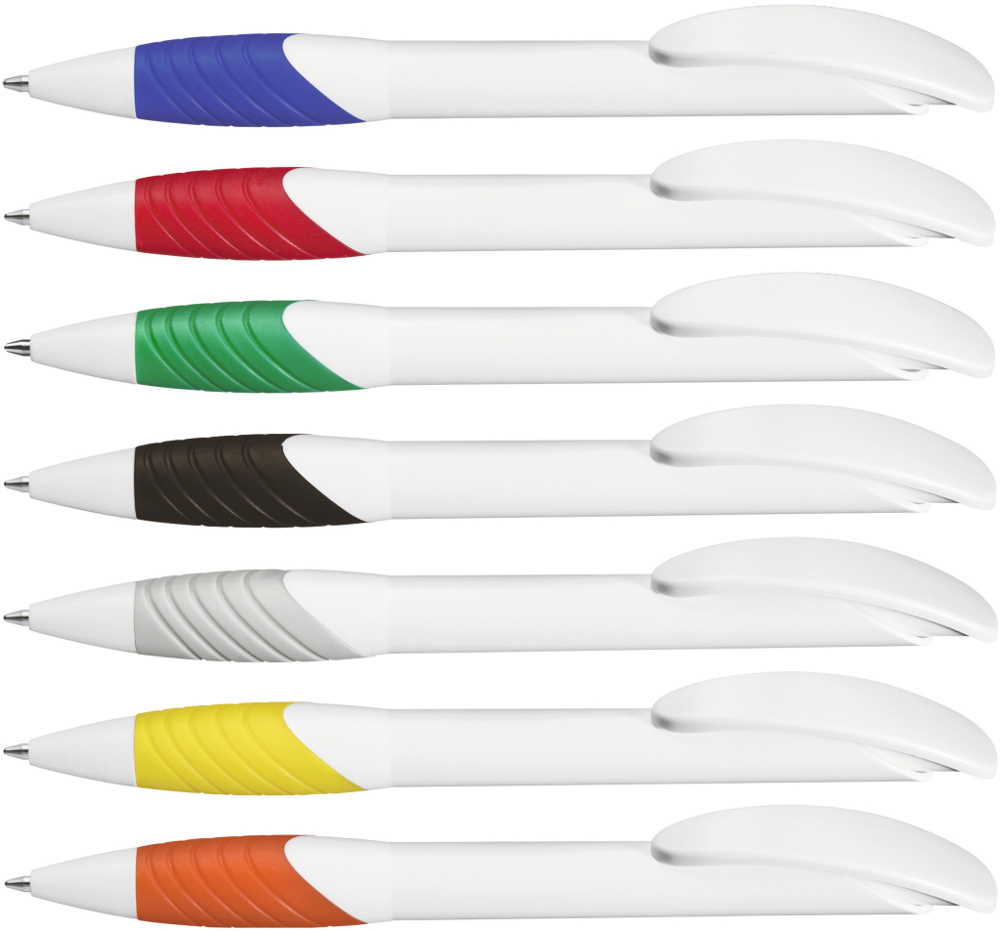 Retractable ballpoint pen with opaque matt housing, curved clip push-button and tip in white, ergonomic coloured rubber grip zone.