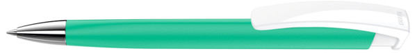 Retractable ballpoint pen with softtouch triangular housing, opaque glossy clip in white and heavy metal tip chrome plated.