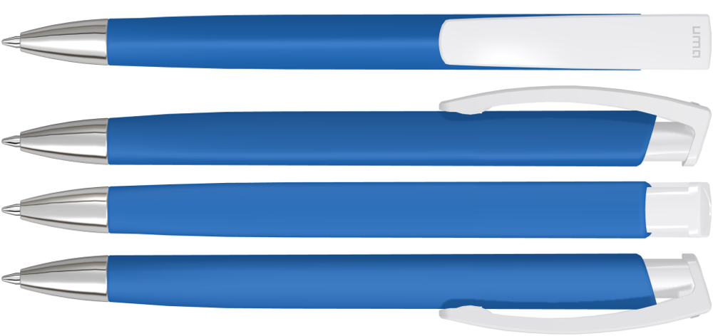 Retractable ballpoint pen with softtouch triangular housing, opaque glossy clip in white and heavy metal tip chrome plated.
