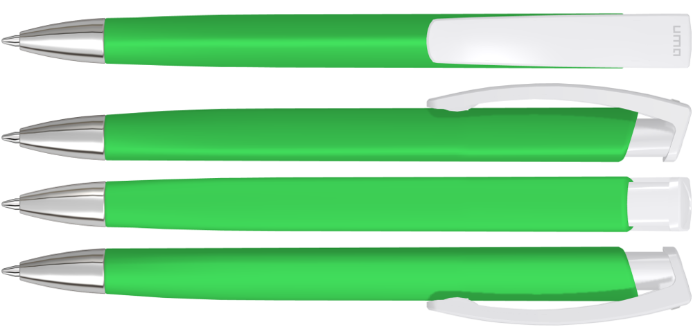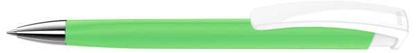 Retractable ballpoint pen with softtouch triangular housing, opaque glossy clip in white and heavy metal tip chrome plated.