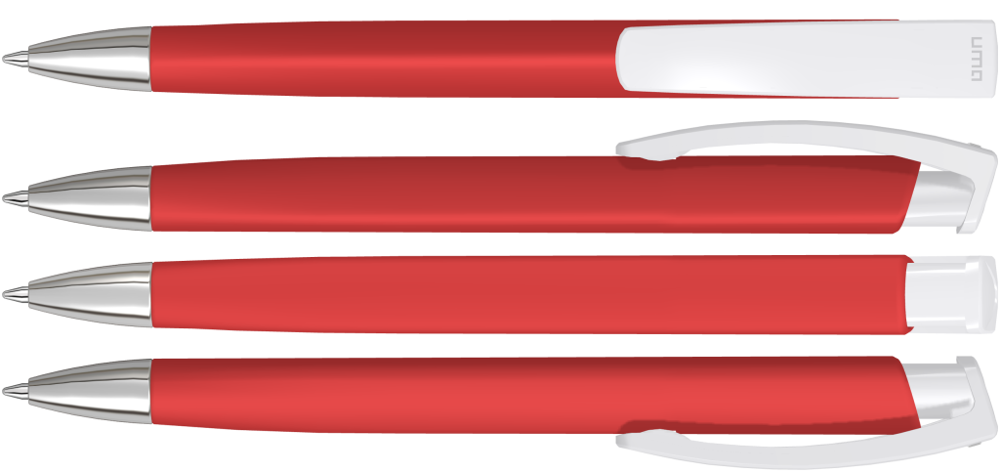 Retractable ballpoint pen with softtouch triangular housing, opaque glossy clip in white and heavy metal tip chrome plated.