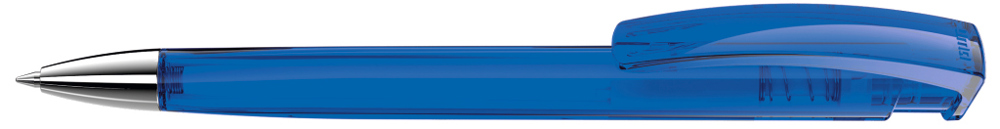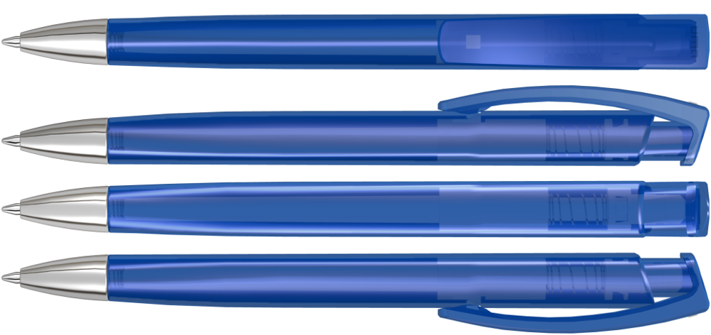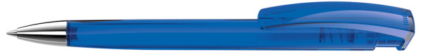 Retractable ballpoint pen with transparent triangular glossy housing and heavy metal tip chrome plated.