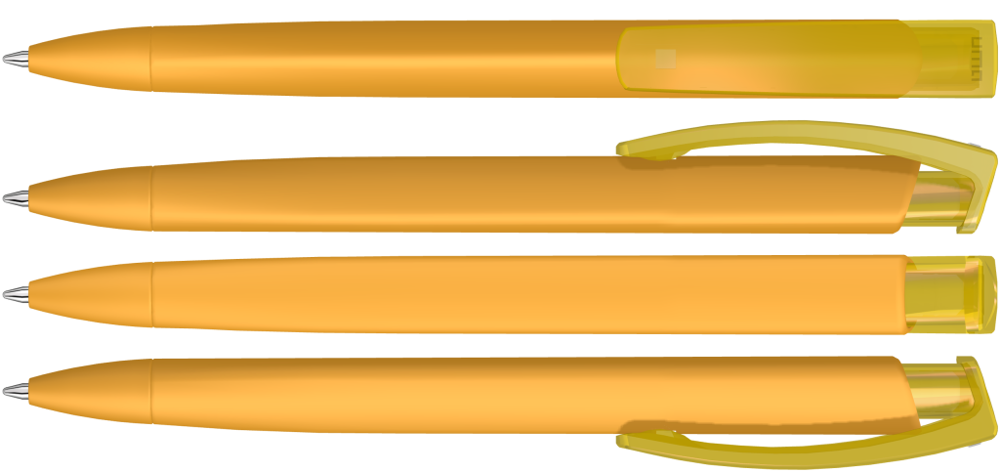 Retractable ballpoint pen with softtouch triangular housing and transparent glossy clip. more