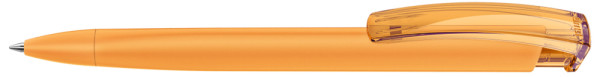 Retractable ballpoint pen with softtouch triangular housing and transparent glossy clip.