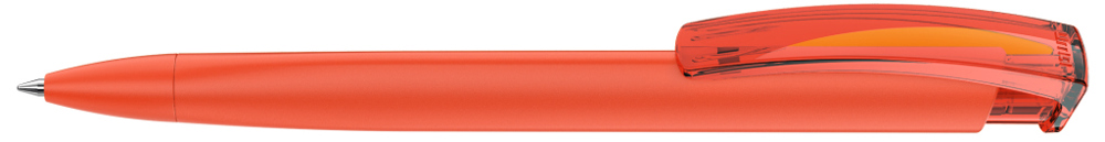 Retractable ballpoint pen with softtouch triangular housing and transparent glossy clip. more