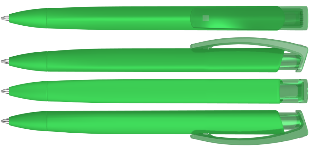 Retractable ballpoint pen with softtouch triangular housing and transparent glossy clip. more