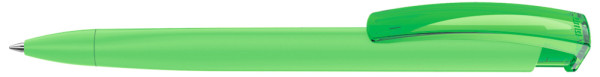 Retractable ballpoint pen with softtouch triangular housing and transparent glossy clip.