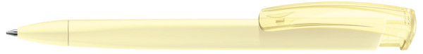 Retractable ballpoint pen with softtouch triangular housing and transparent glossy clip.