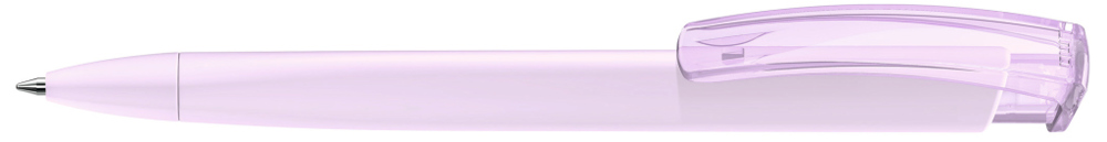 Retractable ballpoint pen with softtouch triangular housing and transparent glossy clip.