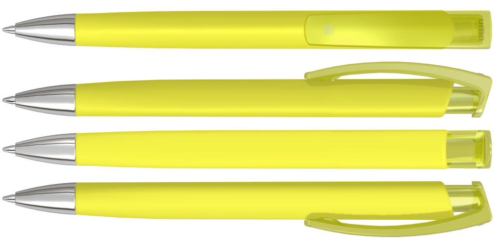 Retractable ballpoint pen with softtouch triangular housing, transparent glossy clip and heavy metal tip chrome plated.