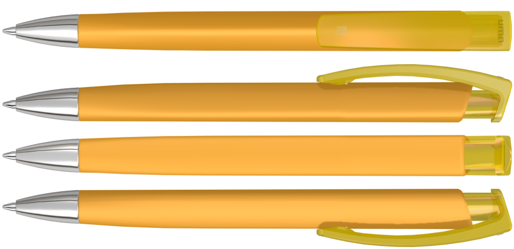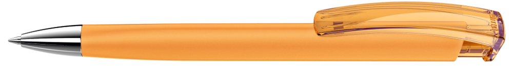 Retractable ballpoint pen with softtouch triangular housing, transparent glossy clip and heavy metal tip chrome plated.