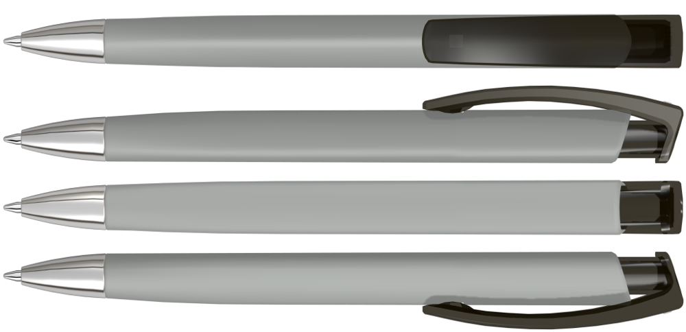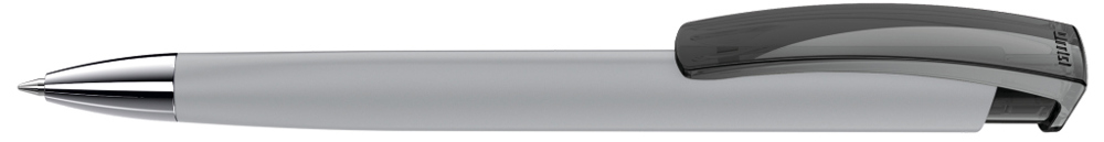 Retractable ballpoint pen with softtouch triangular housing, transparent glossy clip and heavy metal tip chrome plated.