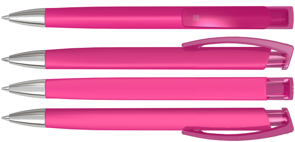 Retractable ballpoint pen with softtouch triangular housing, transparent glossy clip and heavy metal tip chrome plated.