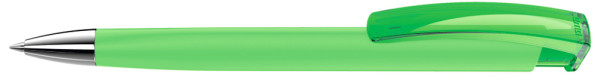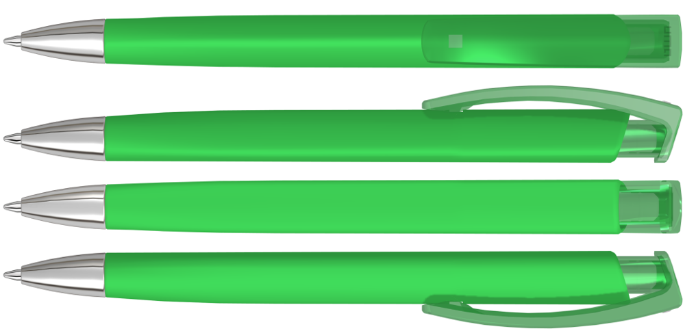 Retractable ballpoint pen with softtouch triangular housing, transparent glossy clip and heavy metal tip chrome plated.