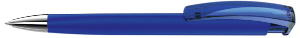 Retractable ballpoint pen with softtouch triangular housing, transparent glossy clip and heavy metal tip chrome plated.
