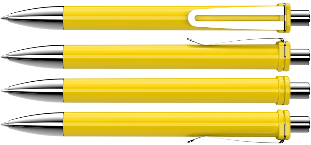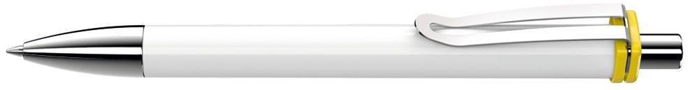 Retractable ballpoint pen with opaque glossy housing and clip holder. Wide flexible metal clip, metal tip and metal push-button chrome plated.