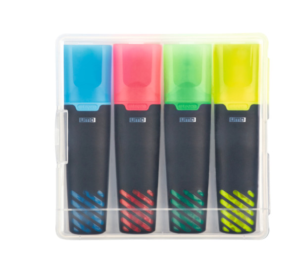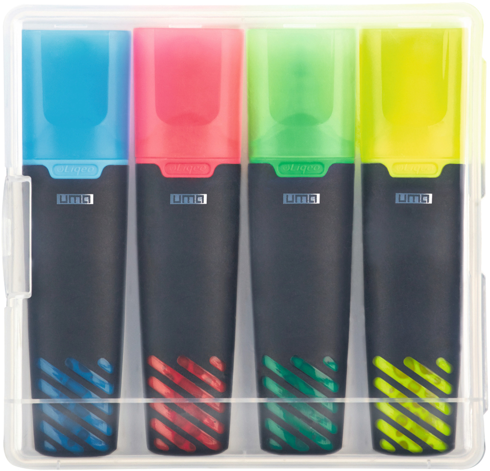 Liquid highlighter set consisting of 4 LIQEO HIGHLIGHTERS in clear transparent plastic packaging. Standard colours for highlighters are yellow, green, pink and blue. Optional colours orange and purple can be chosen.