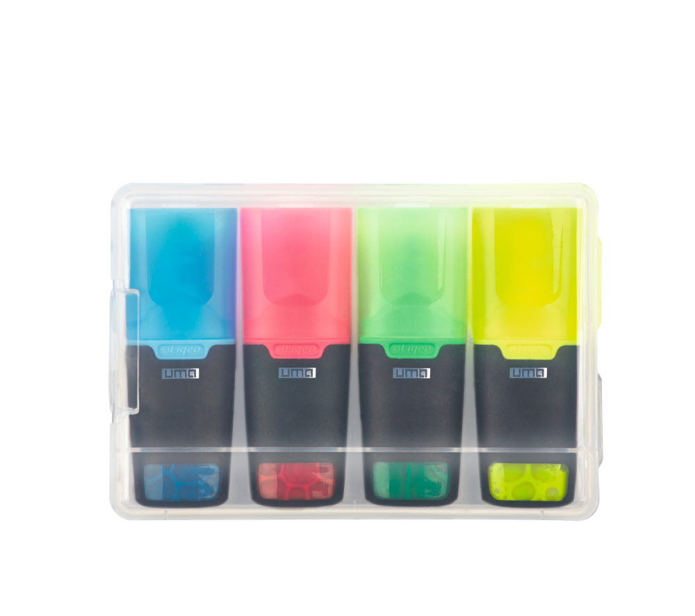 Liquid highlighter set consisting of 4 LIQEO HIGHLIGHTERS MINI in clear transparent plastic packaging. Standard colours for highlighters are yellow, green, pink and blue. Optional colours orange and purple can be chosen.