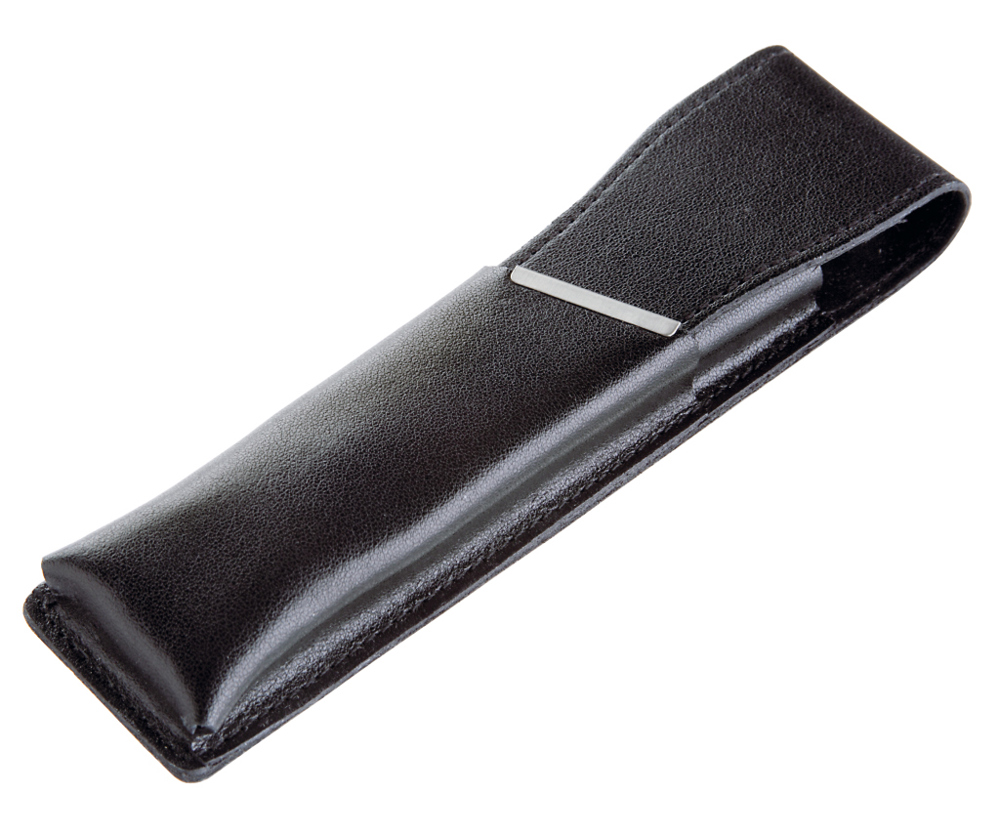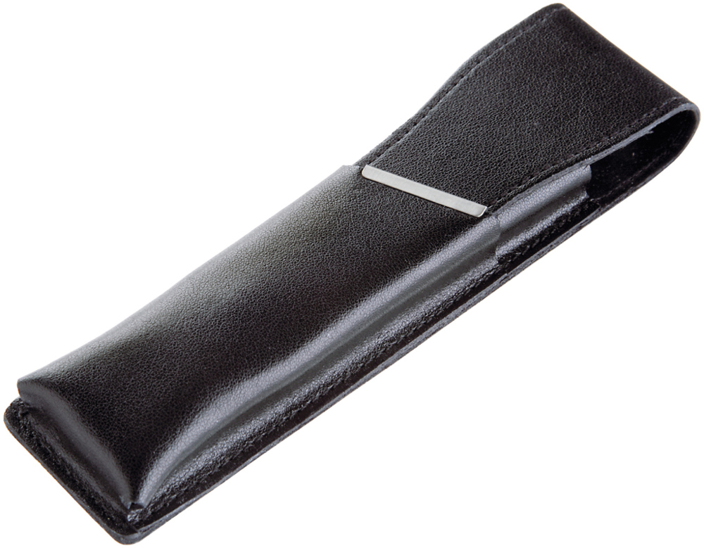 Black leather case for one or two writing instruments with silver-coloured metal strip.