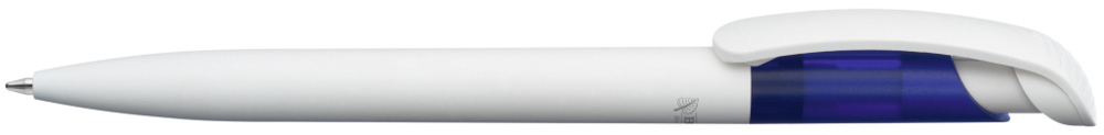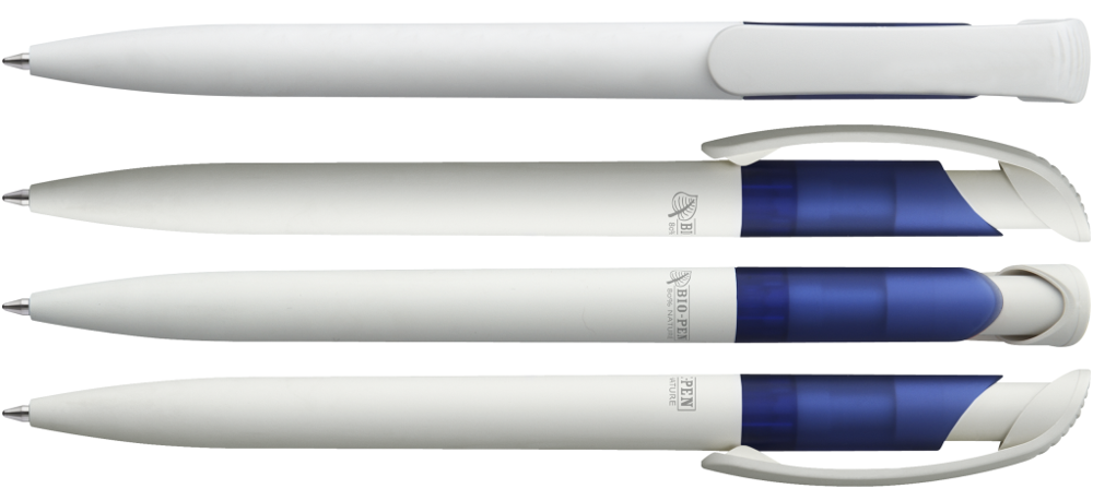 Retractable ballpoint pen with barrel and clip made from 100% renewable biodegradable material. Upper part made from transparent frosted ABS plastic.