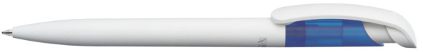 Retractable ballpoint pen with barrel and clip made from 100% renewable biodegradable material. Upper part made from transparent frosted ABS plastic.