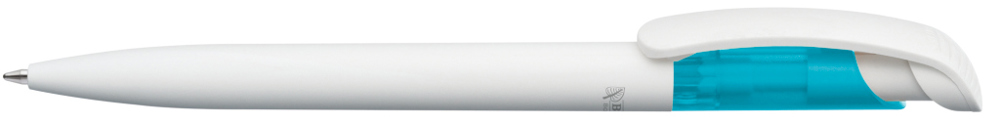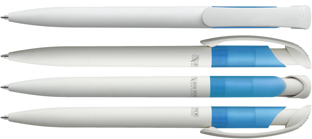 Retractable ballpoint pen with barrel and clip made from 100% renewable biodegradable material. Upper part made from transparent frosted ABS plastic.