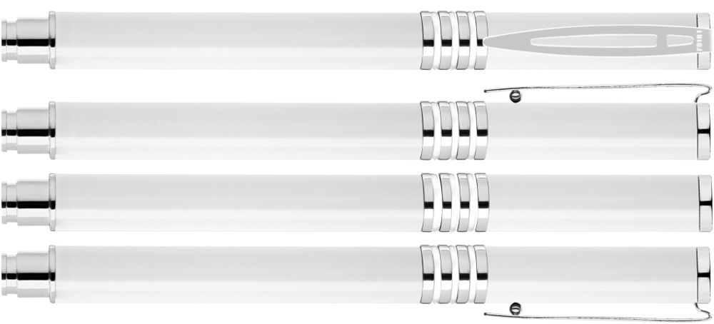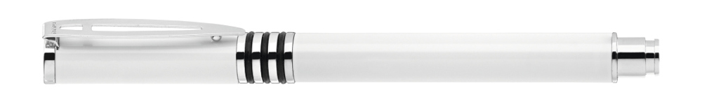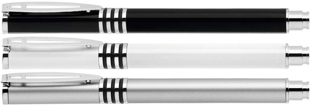 Metal rollerball with glossy lacquered aluminum housing and 3 recessed combinable rubber rings in the barrel. Metal fittings chrome plated.