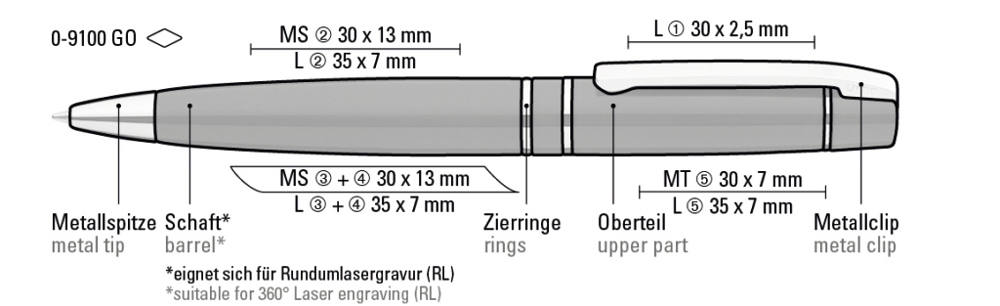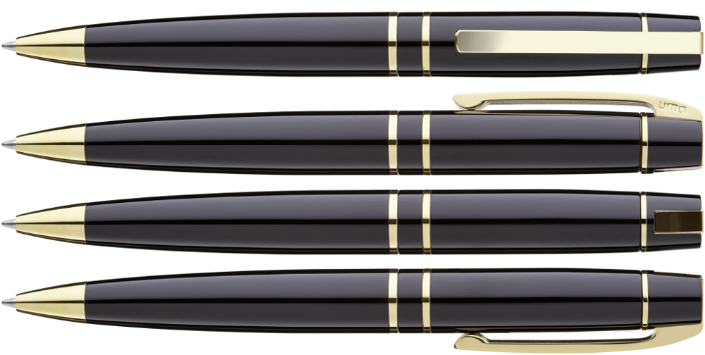 Metal twist ballpoint pen with soft twist mechanism and spring-mounted clip. Fittings gold plated.