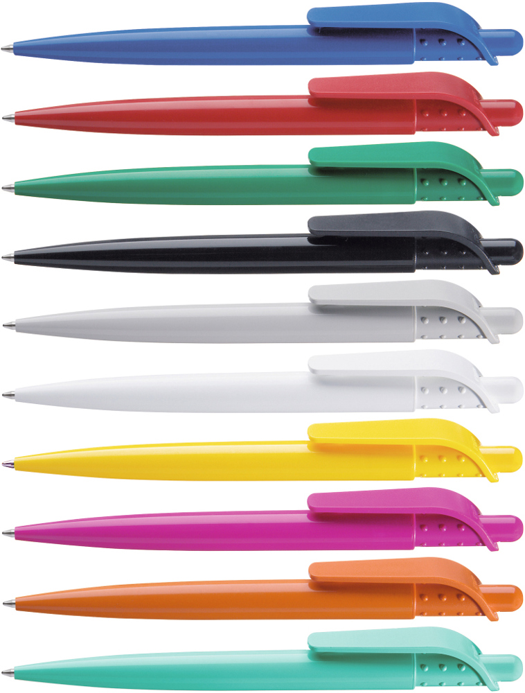 Retractable ballpoint pen with opaque glossy housing and large clip on nubbed clip holder.
