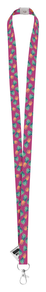 Custom made, 15 mm wide RPET lanyard with metal carabiner and wheat straw plastic safety buckle. With sublimation printed graphics on both sides. MOQ: 100 pcs.