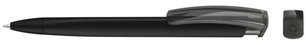 Retractable ballpoint pen with opaque matt triangular housing and transparent glossy clip made from recycled ABS plastic. The model is labelled with the recycling mark.