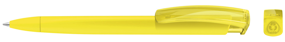 Retractable ballpoint pen with opaque matt triangular housing and transparent glossy clip made from recycled ABS plastic. The model is labelled with the recycling mark.