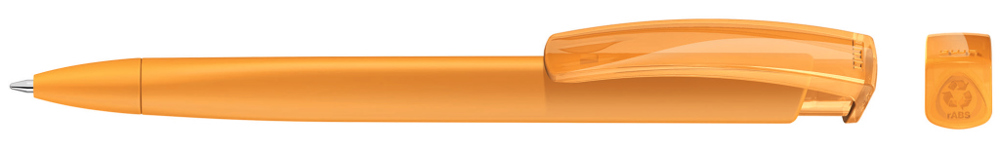 Retractable ballpoint pen with opaque matt triangular housing and transparent glossy clip made from recycled ABS plastic. The model is labelled with the recycling mark.