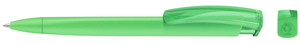 Retractable ballpoint pen with opaque matt triangular housing and transparent glossy clip made from recycled ABS plastic. The model is labelled with the recycling mark.