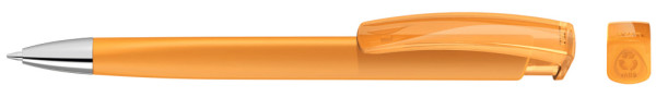 Retractable ballpoint pen with opaque matt triangular housing, transparent glossy clip made from recycled ABS plastic and heavy metal tip chrome plated. The model is labelled with the recycling mark.
