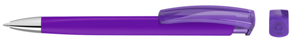 Retractable ballpoint pen with opaque matt triangular housing, transparent glossy clip made from recycled ABS plastic and heavy metal tip chrome plated. The model is labelled with the recycling mark.
