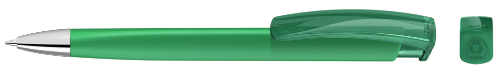 Retractable ballpoint pen with opaque matt triangular housing, transparent glossy clip made from recycled ABS plastic and heavy metal tip chrome plated. The model is labelled with the recycling mark.