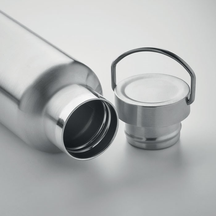 Double wall insulating vacuum bottle in recycled stainless steel (90 % recycled stainless steel and 10% stainless steel) with lid with handle. Capacity: 500 ml.