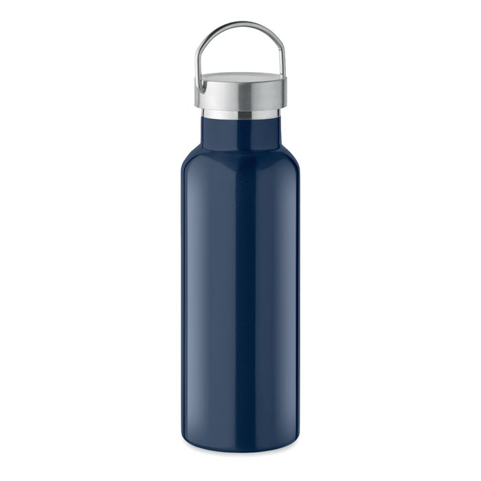 Double wall insulating vacuum bottle in recycled stainless steel (90 % recycled stainless steel and 10% stainless steel) with lid with handle. Capacity: 500 ml.