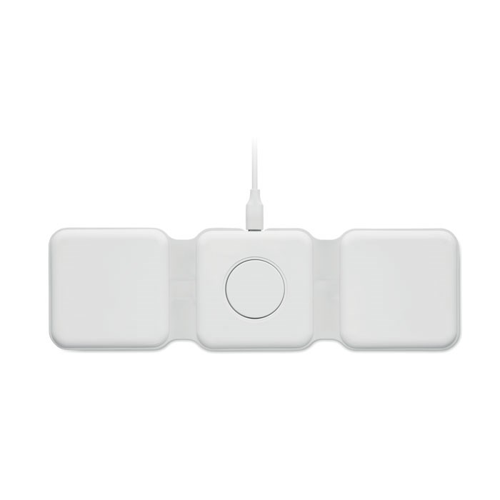3 in 1 foldable charging station in ABS. It has 3 wireless charging spots (15W). Input: 2-in-1 Type-C and Type-A.